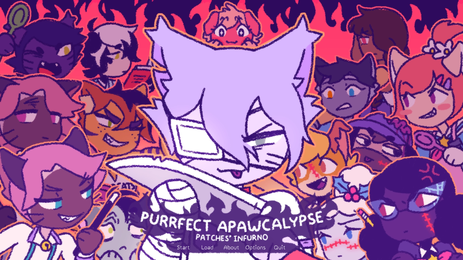 Purrfect Apawcalypse: Patches’ Infurno is the last game of a visual novel trilogy about dogs, cats and the apocalypse. The places you go, characters you meet and choices you make will lead you to either death or happiness, so choose wisely!